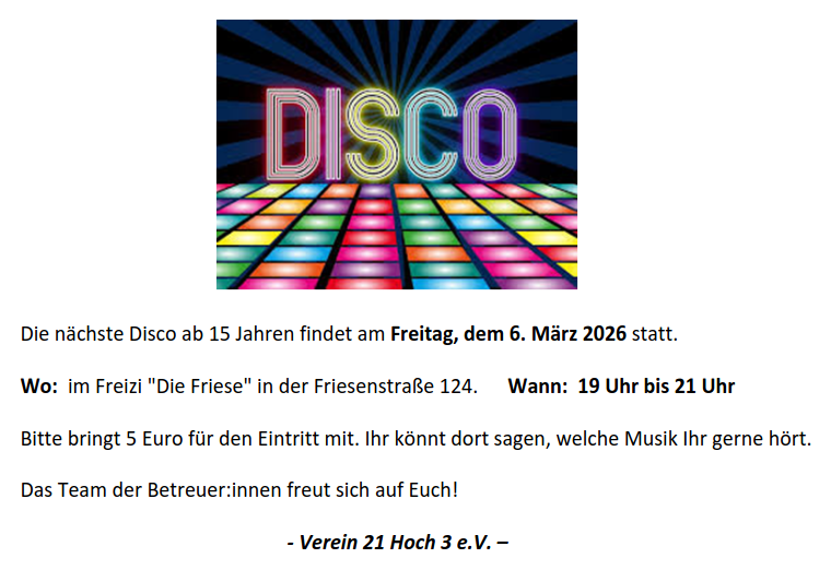 Friese-Disco unregelmäßig | Freitag | 19.00 – 21.00 Uhr | Freizi „Die Friese“ , Friesenstraße 124 Disco ab 15 Jahren, Musik kann gewünscht werden.